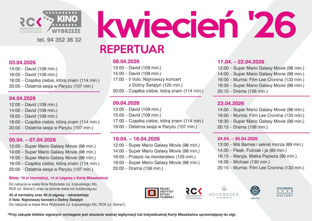 17 kwietnia, repertuar kina Wybrzeże Post published:12 kwietnia 2026 Post category:Nie przegap Post comments:0 Komentarzy Repertuar kina Wybrzeże. artykuły Poprzedni wpis16 kwietnia, Agnieszka Wasztyl „Z plecakiem przez Azję Środkową” Następny wpisMinimalna przegrana Kotwicy. Mecz o wszystko już w środę Dodaj komentarz Anuluj pisanie odpowiedziKomentarzeEnter your name or username to comment Enter your email address to comment Urządzenia mobilne (opcjonalnie) Zapamiętaj moje dane w tej przeglądarce podczas pisania kolejnych komentarzy. Δ