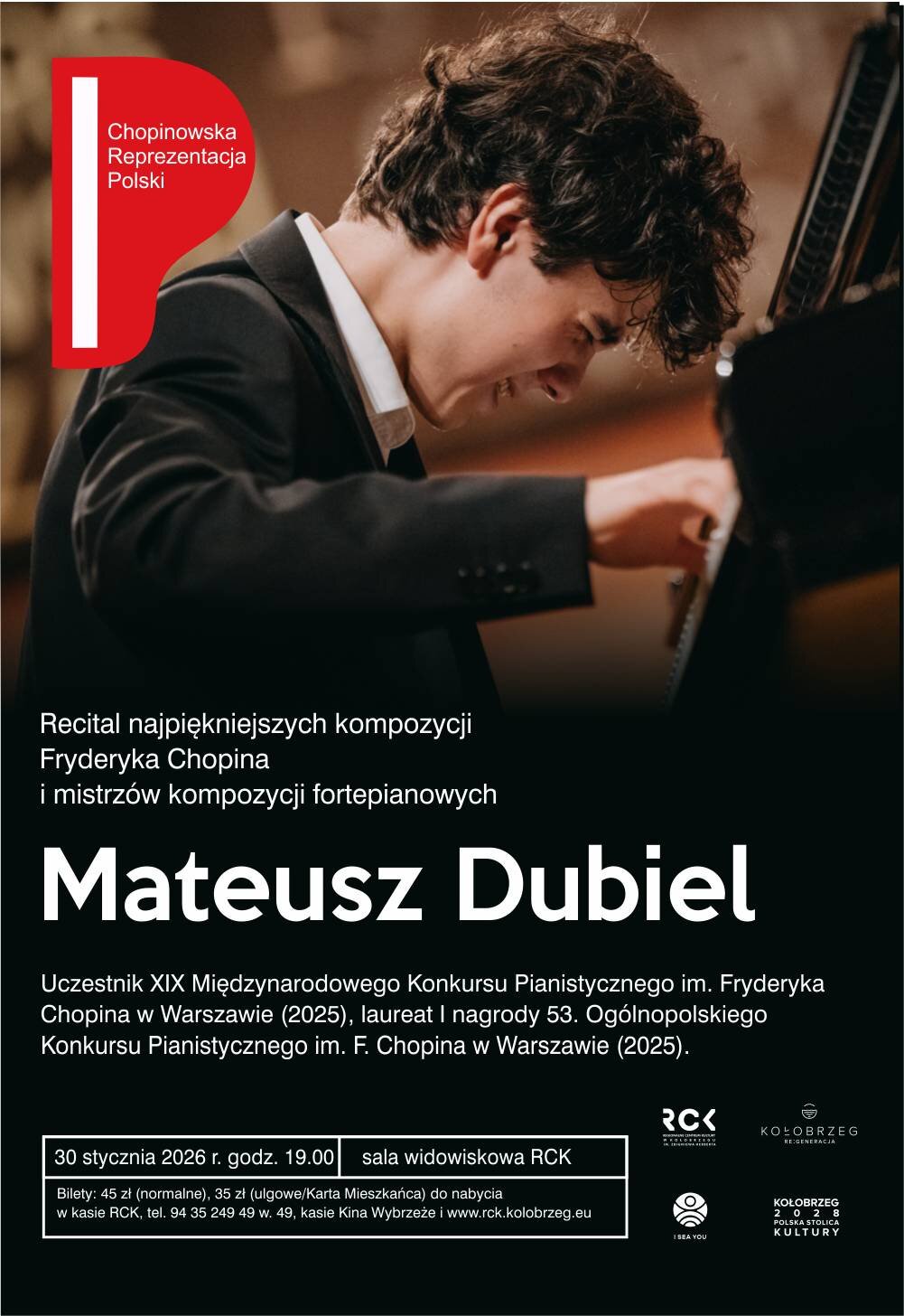 W programie recitalu znajdą się najpiękniejsze kompozycje Fryderyka Chopina, a także dzieła mistrzów fortepianu. Interpretacje Mateusza Dubiela wyróżniają się dojrzałością, wrażliwością i wyjątkową osobowością sceniczną – to spotkanie z żywą tradycją polskiej szkoły chopinowskiej.