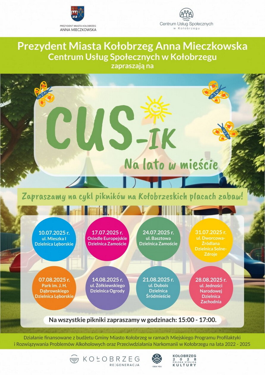 Centrum Usług Społecznych w Kołobrzegu zaprasza dzieci w wieku 3–12 lat oraz ich opiekunów na cykl letnich pikników pełnych zabawy, edukacji i profilaktyki. Celem wydarzeń jest promowanie zdrowego stylu życia i alternatywnych form spędzania czasu. Harmonogram na plakacie – najbliższy odbędzie się 31 lipca przy ul. Dworcowej/Źródlana.