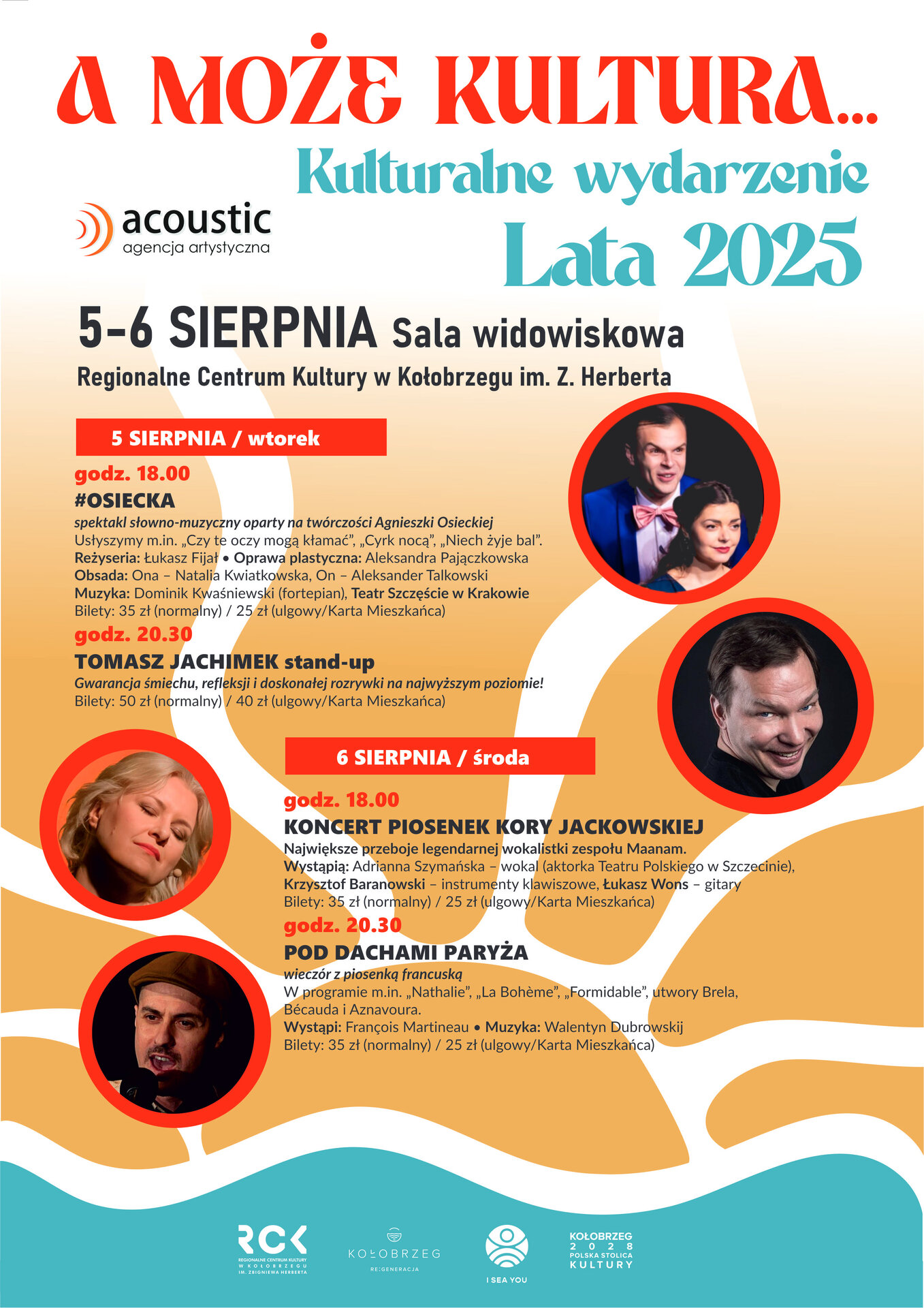 RCK zaprasza na nowe wydarzenie w Kołobrzegu, a mianowicie Festiwal „A może kultura…”, który odbędzie się w dniach 5-6 sierpnia 2025 roku w sali widowiskowej Regionalnego Centrum Kultury im. Zbigniewa Herberta.