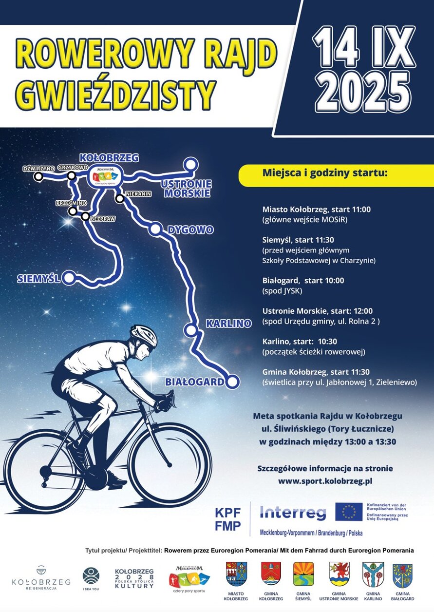 Start Kołobrzeskiego Rajdu Gwieździstego z MOSiR Kołobrzeg o godzinie 11:00 – dołącz do naszej rowerowej kolumny i razem pokonajmy trasę, gdzie zakończymy ją na Torach Łuczniczych Miejskiego Ośrodka Sportu i Rekreacji, gdzie między 13:00 a 13:30 spotykamy się ze wszystkimi uczestnikami rajdu!