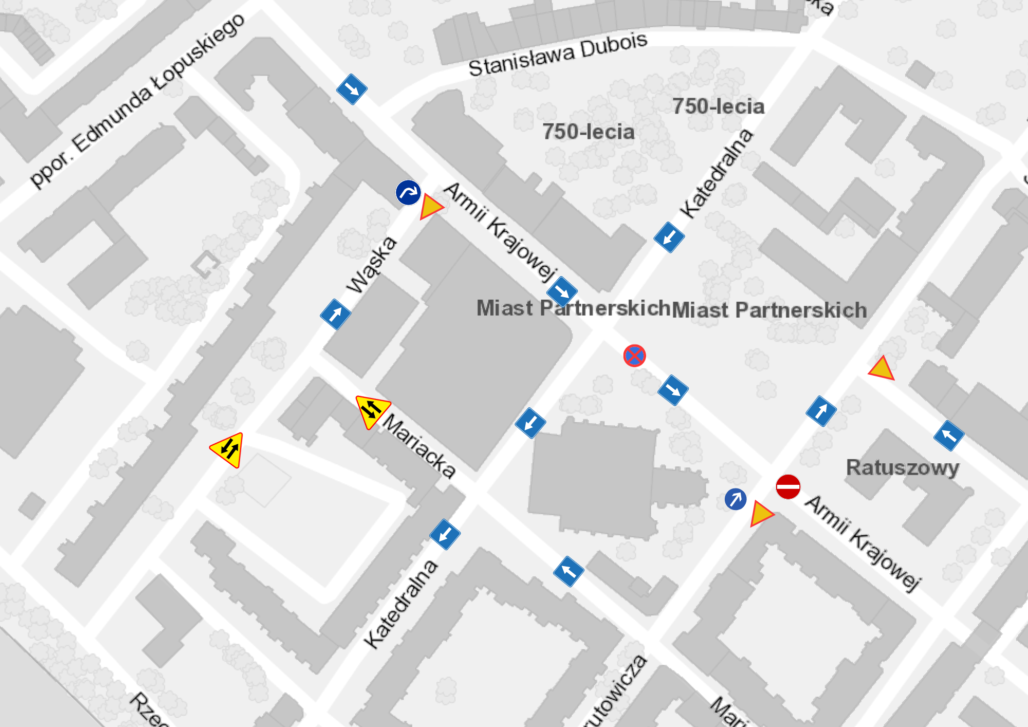 - Na ulicy Armii Krajowej (od ulicy E. Łopuskiego do Placu Ratuszowego) będzie obowiązywał ruch jednokierunkowy,
