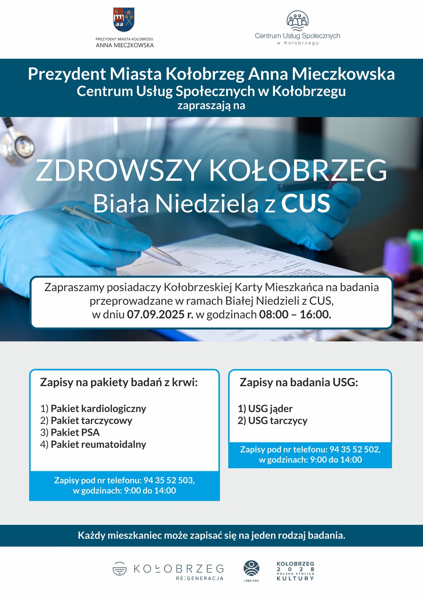 W niedzielę 7 września 2025 r. posiadacze Kołobrzeskiej Karty Mieszkańca będą mogli wykonać bezpłatne badania profilaktyczne w ramach akcji Biała Niedziela z Centrum Usług Społecznych w Kołobrzegu: