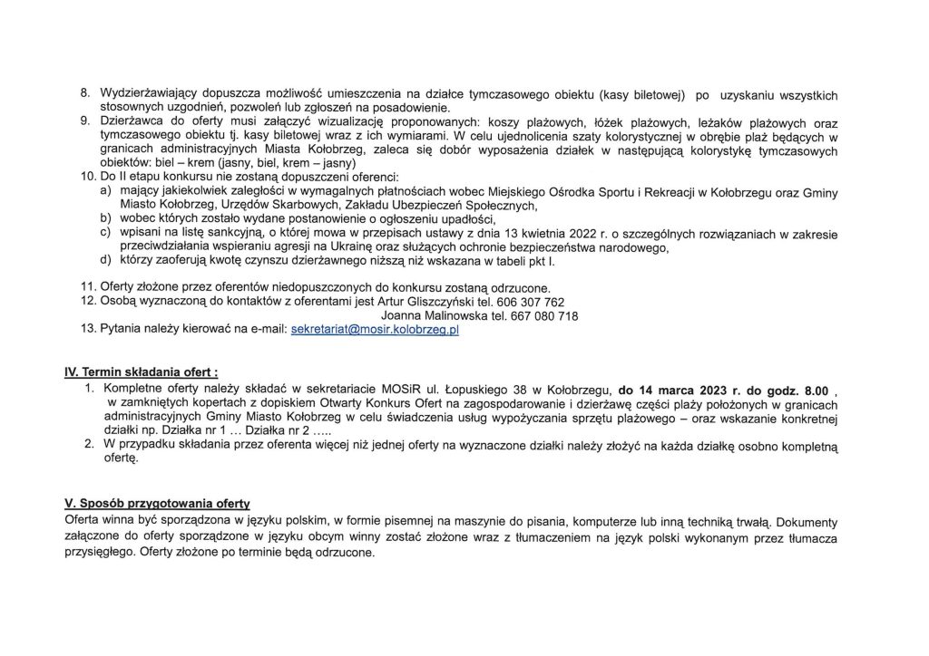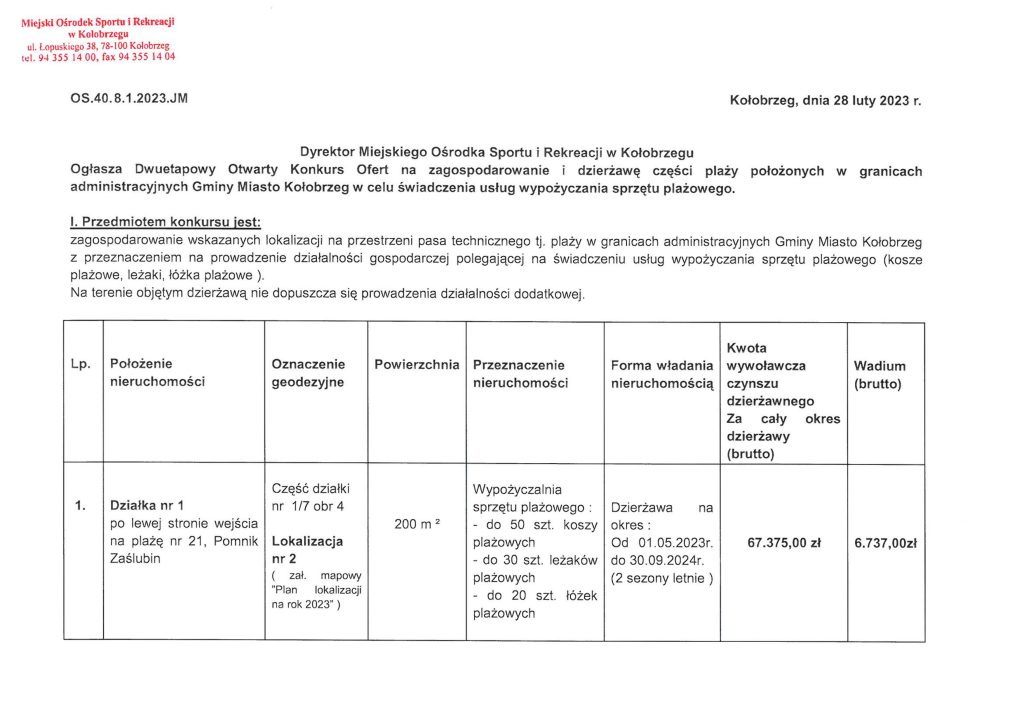 Miejski Ośrodek Sportu i Rekreacji ogłosił dwuetapowy otwarty konkurs ofert na zagospodarowanie i dzierżawę części plaży w celu świadczenia usług wypożyczania sprzętu plażowego (np. leżaków czy koszy plażowych).