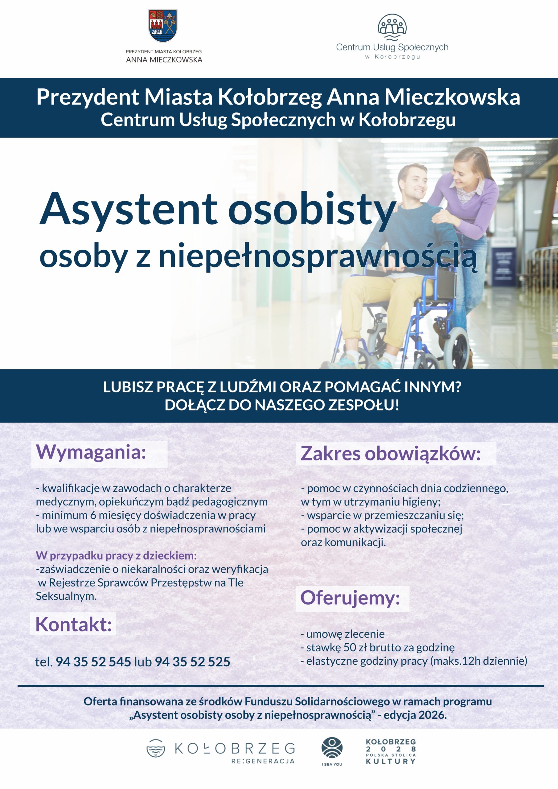 Centrum Usług Społecznych w Kołobrzegu zaprasza osoby zainteresowane pracą na stanowisku asystenta osobistego osoby z niepełnosprawnością. To oferta skierowana do kandydatów, którzy chcą realnie pomagać innym i wspierać ich w codziennym funkcjonowaniu.