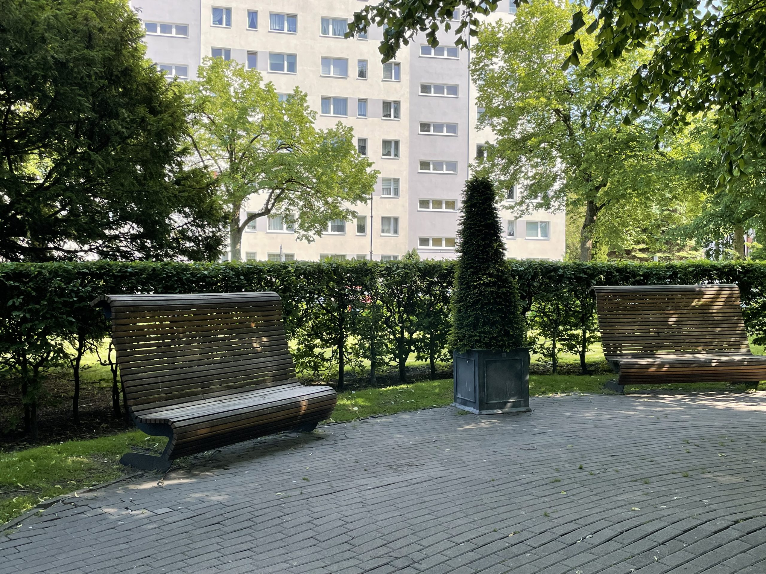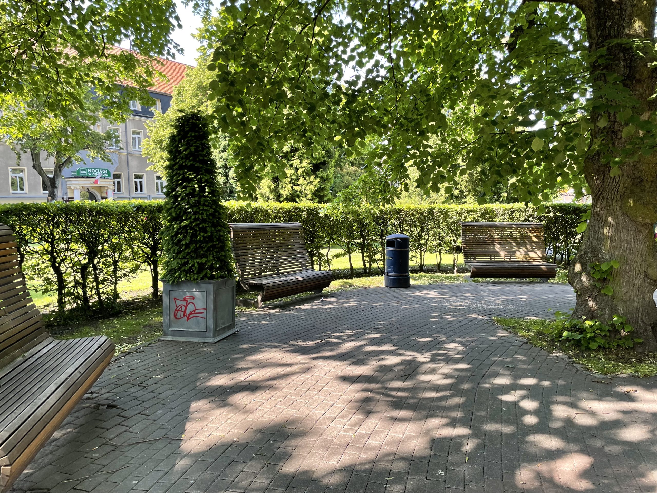 Cztery duże donice z drzewkami ozdobnymi, które stały na ul. Narutowicza, stoją dziś na Placu Słowiańskim.