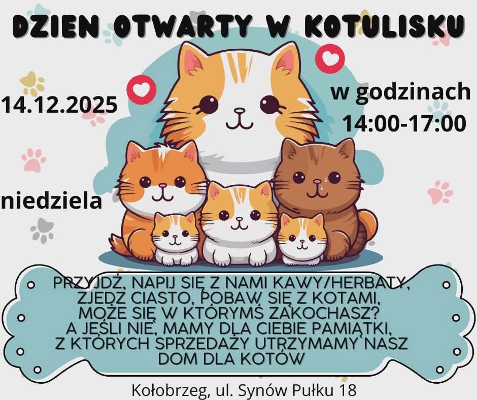 Wolontariuszki podkreślają, że każdy z ich podopiecznych ma za sobą trudną historię, ale jednocześnie ogromną potrzebę bliskości. Okazja, by poznać kocich podopiecznych Kotuliska przy ul. Synów Pułku 18 osobiście, już 14 grudnia, kiedy to odbędzie się dzień otwarty. To wyjątkowe wydarzenie ma zachęcić mieszkańców Kołobrzegu i okolic do odwiedzin oraz poznania historii zwierząt i być może ich adopcji.