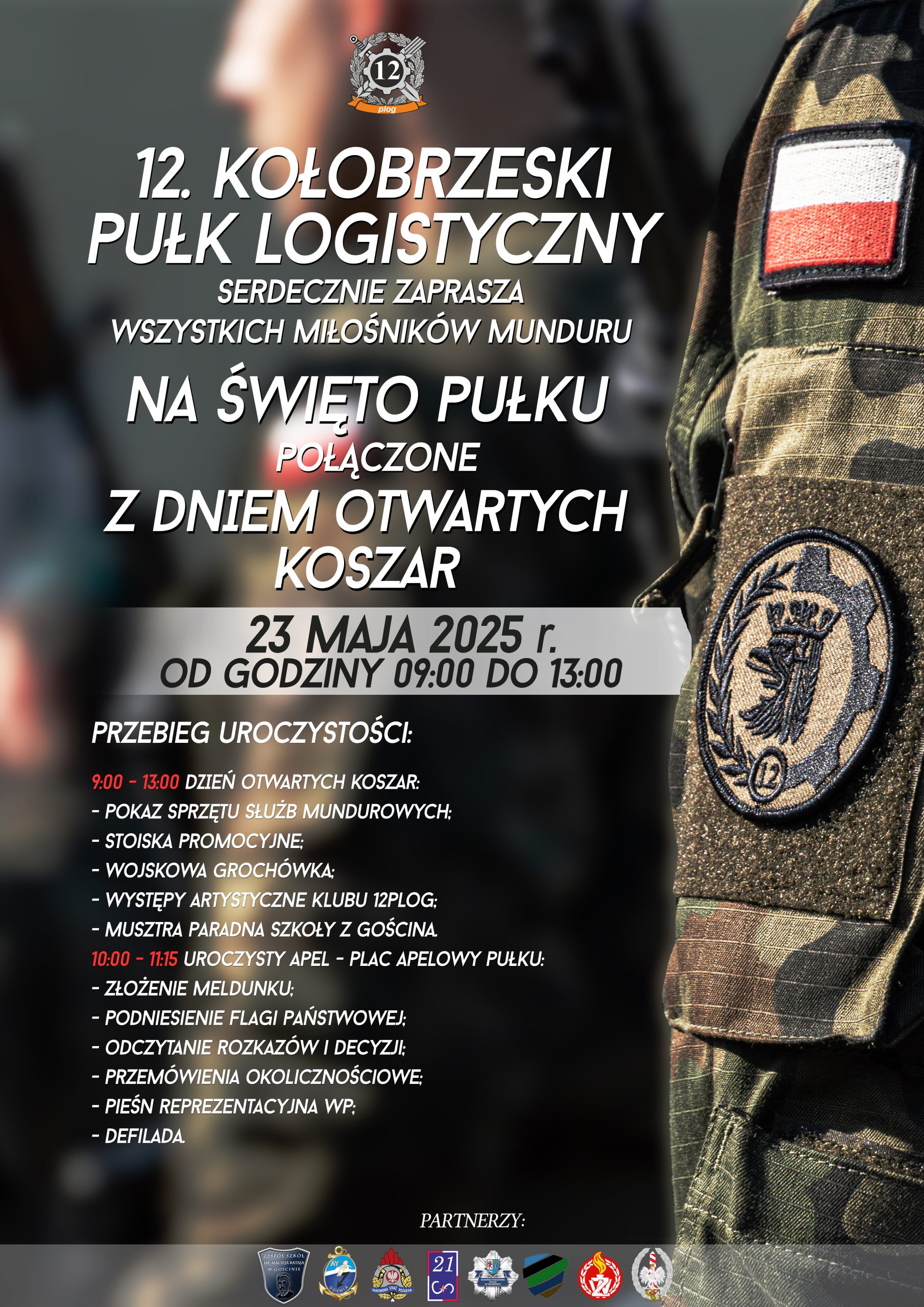 O godzinie 10:00 odbędzie się uroczysty apel z udziałem żołnierzy, orkiestry i zaproszonych gości. To doskonała okazja, aby z bliska poznać codzienną służbę żołnierzy 12 Pułku Logistycznego, zobaczyć wojskowy sprzęt oraz wspólnie świętować ten wyjątkowy dzień.