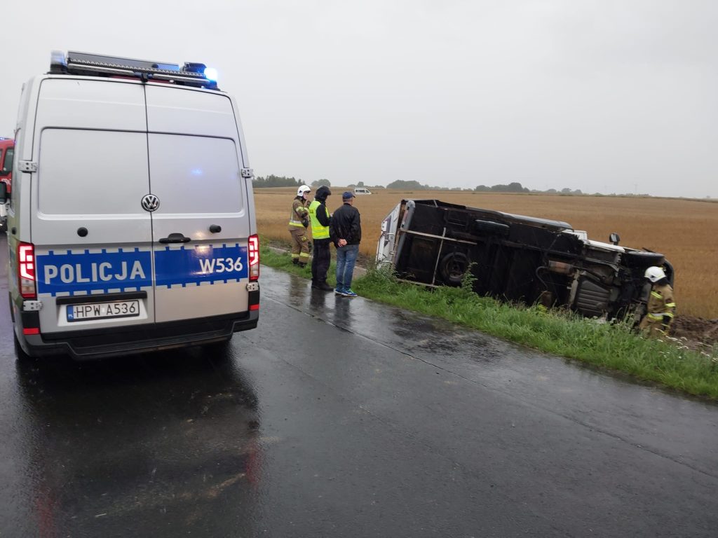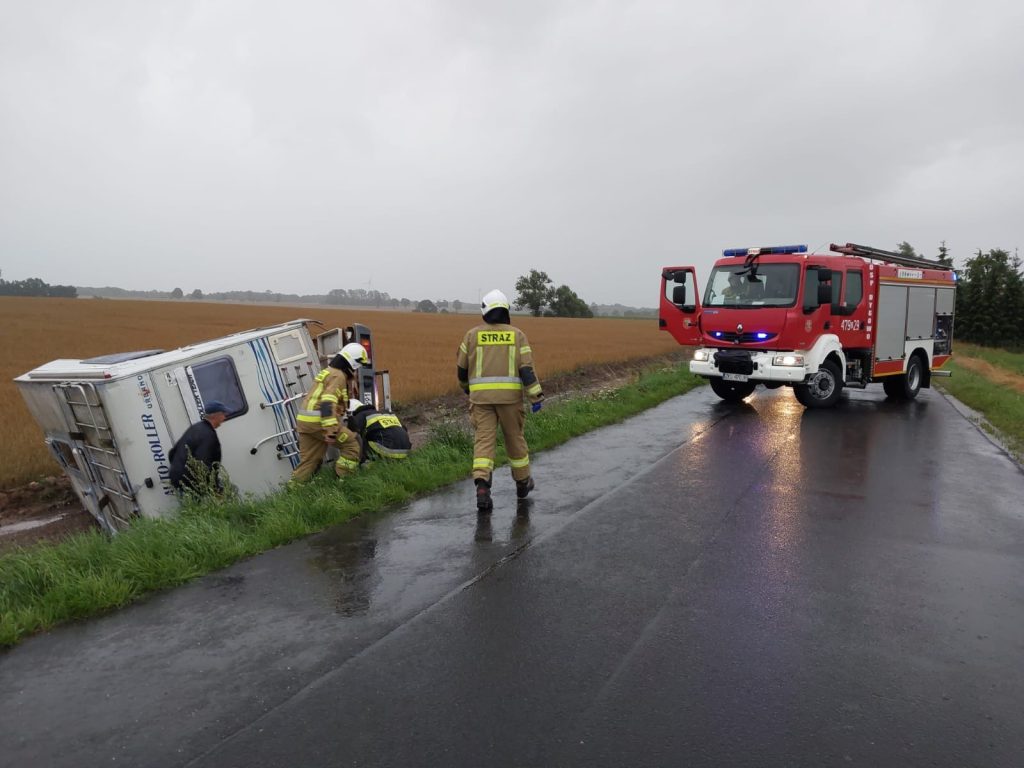 Na drodze w okolicy Stojkowa kamper wpadł w poślizg, zjechał do rowu i wylądował na boku. Z pomocą przyjechały ochotnicze zastępy Straży Pożarnej z Czernina i Dygowa. \