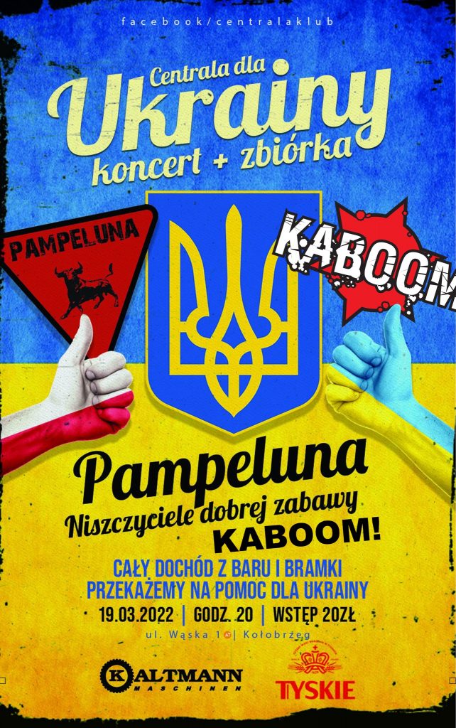 19 marca w klubie Centrala zagrają Pampeluna, Kaboom! oraz Niszczyciele Dobrej Zabawy. Cały dochód z baru i biletów zostanie przekazany na pomoc Ukrainie, która walczy z rosyjskim najeźdźcą. Co ważne, zebraną kwotę podwoi firma Kaltmann.