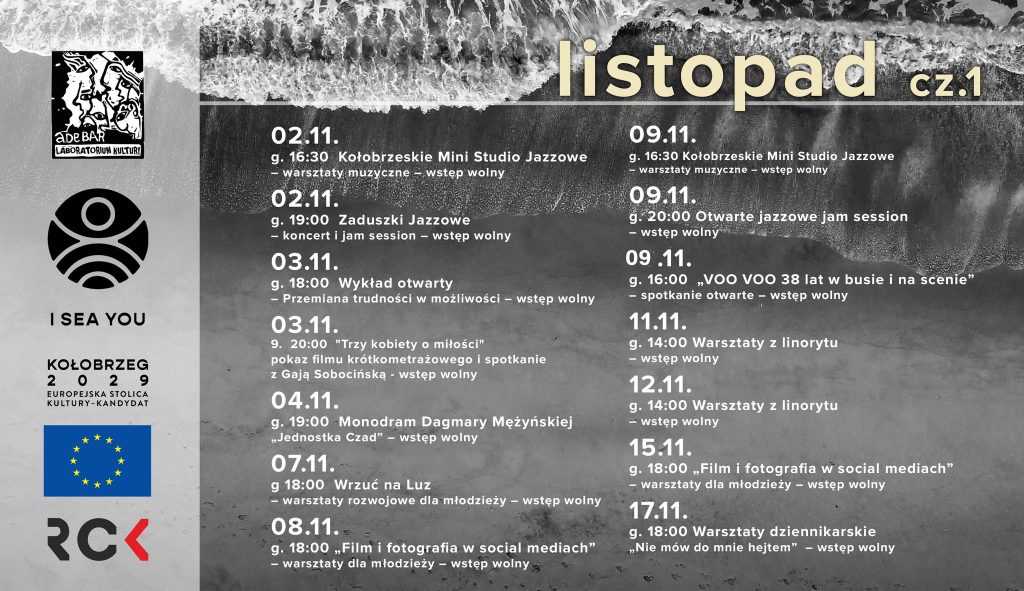 Coraz więcej rzeczy dzieje się w kołobrzeskiej kulturze. Rękawicę największej instytucji kultury w mieście, jakim jest Regionalne Centrum kultury, rzuciły mniejsze ośrodki, które proponują coraz więcej ciekawych wydarzeń. Biblioteka, klub Centrala oraz najmłodsze w tym gronie Laboratorium Kultury Adebar (formalnie w strukturach RCK) i filia biblioteki na Ogrodach dorzuciły do listopadowego programu wydarzeń dużo swoich propozycji.