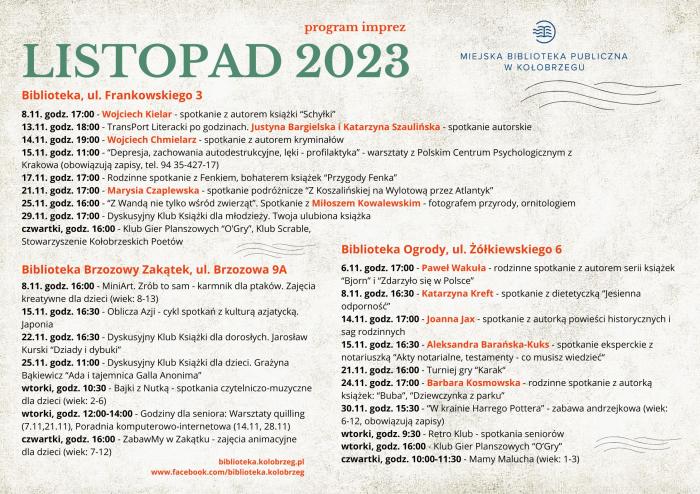 Miejska Biblioteka Publiczna co rusz zaprasza na spotkania z pisarzami, ale nie tylko. W listopadzie będzie można przyjść do biblioteki przy Frankowskiego m.in. na spotkanie z autorem kryminałów Wojciechem Chmielarzem (14.11), spotkanie z podróżniczką Marysią Czaplewską (21.11) lub warsztaty z psychologiem, by porozmawiać o depresji i o tym, jak sobie z nią radzić (15.11).