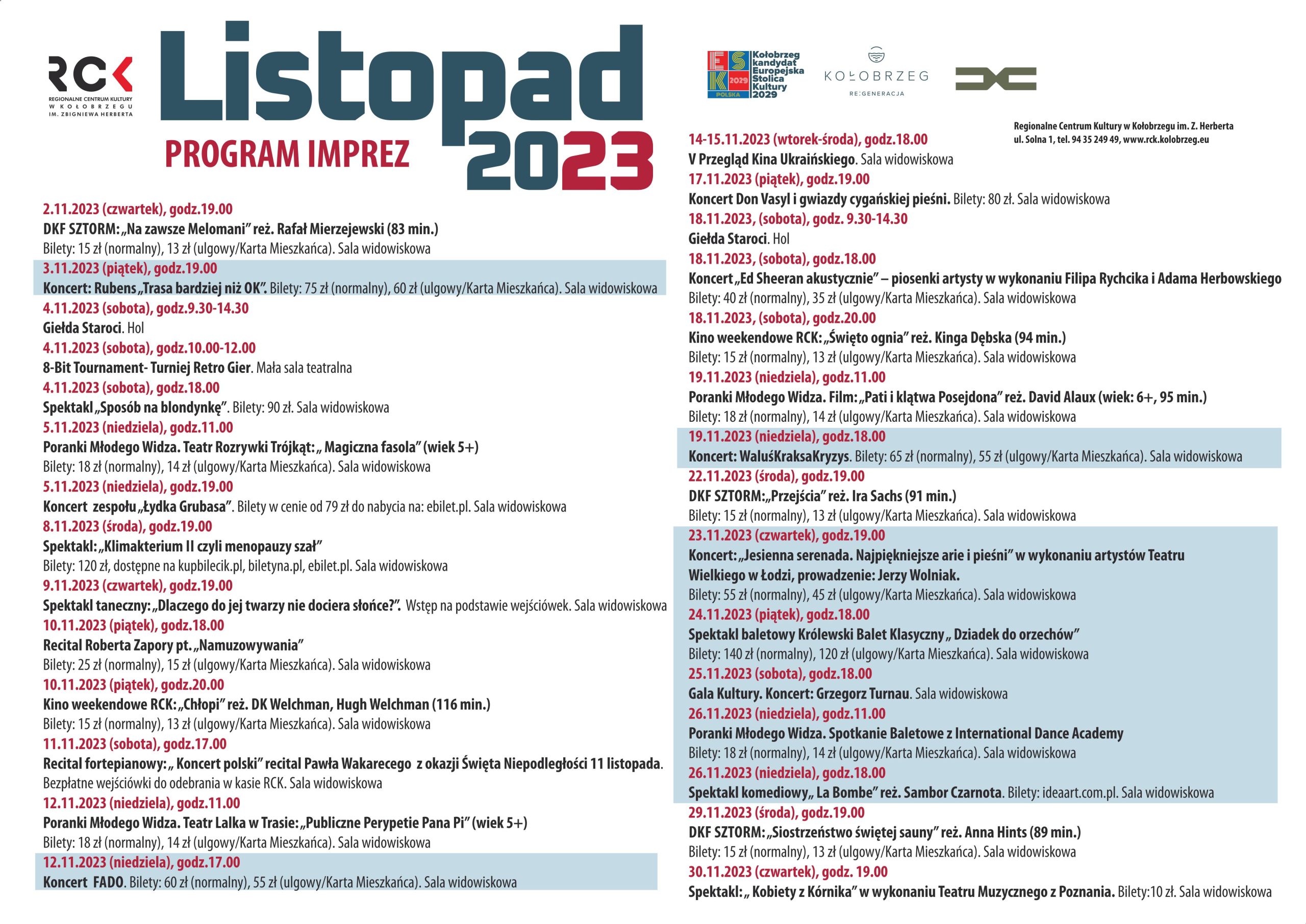 I tak, RCK zaprasza na cykliczne Poranki Młodego Widza, Giełdę Staroci czy Dyskusyjny Klub Filmowy „Sztorm”. W listopadowym programie jest jeszcze m.in. recital fortepianowy (11.11), koncert Fado (12.11), Przegląd Kina Ukraińskiego (14-15.11) i spektakl baletowy „Dziadek do orzechów” Królewskiego Baletu Klasycznego (24.11).