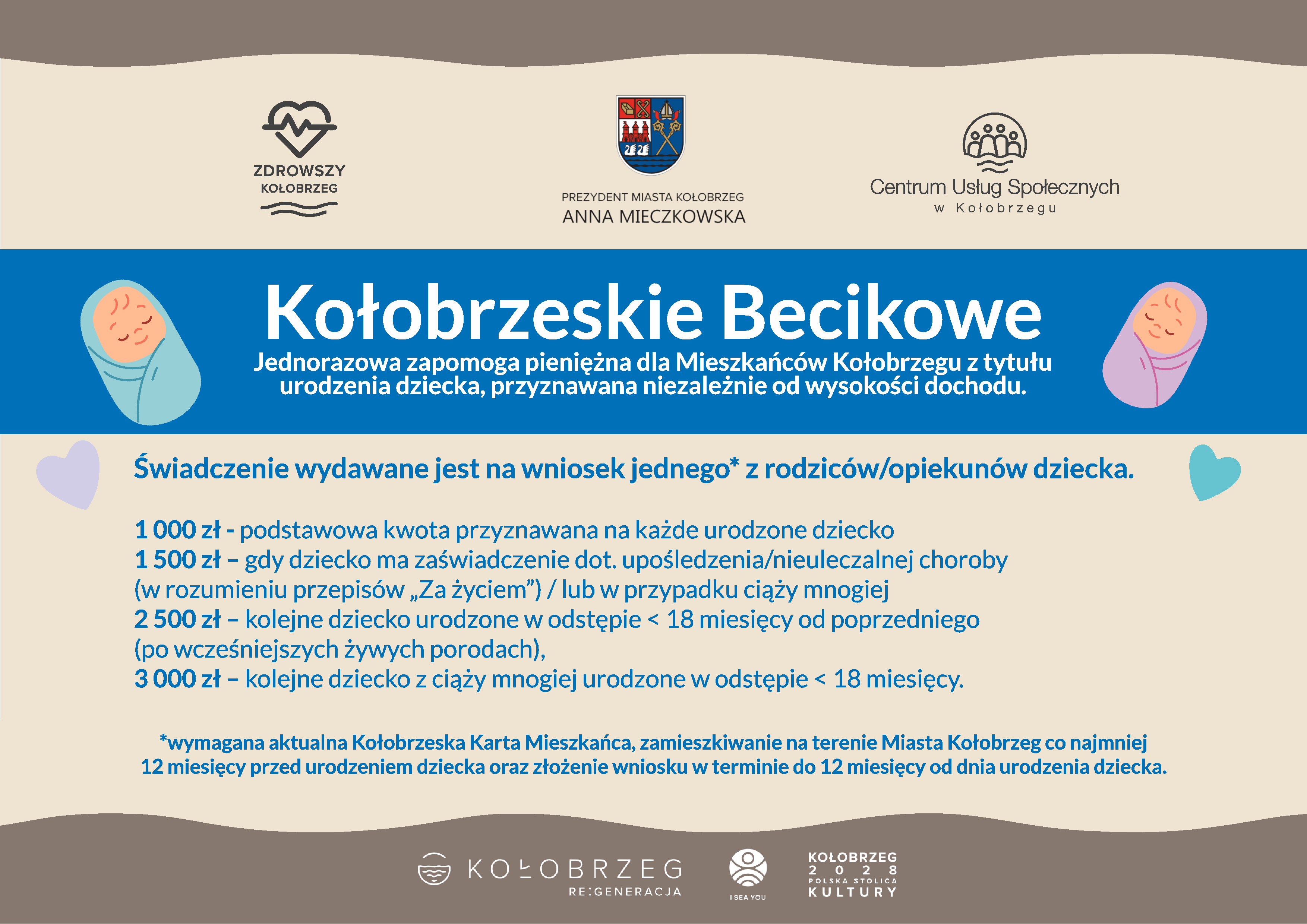 Nowe zasady „Kołobrzeskiego becikowego” przewidują zwiększenie kwoty świadczenia oraz dodatkowe progi w szczególnych sytuacjach. Kwota podstawowa ma wzrosnąć z 500 zł do 1 000 zł. Świadczenie w wysokości 1 500 zł przysługuje m.in. w przypadku ciąży mnogiej lub wskazań zdrowotnych dziecka, zgodnie z przepisami programu „Za życiem”. Kwota 2 500 zł dotyczy kolejnego dziecka urodzonego w odstępie poniżej 18 miesięcy, natomiast 3 000 zł – kolejnego dziecka z ciąży mnogiej urodzonego w takim odstępie. Świadczenie przysługuje jednemu z rodziców lub opiekunów m.in. pod warunkiem zamieszkiwania w Kołobrzegu co najmniej 12 miesięcy przed urodzeniem dziecka, posiadania aktualnej Karty Mieszkańca oraz złożenia wniosku do 12 miesięcy od narodzin dziecka, z przewidzianymi wyjątkami. Nie ma możliwości pobrania analogicznego świadczenia w innej gminie.