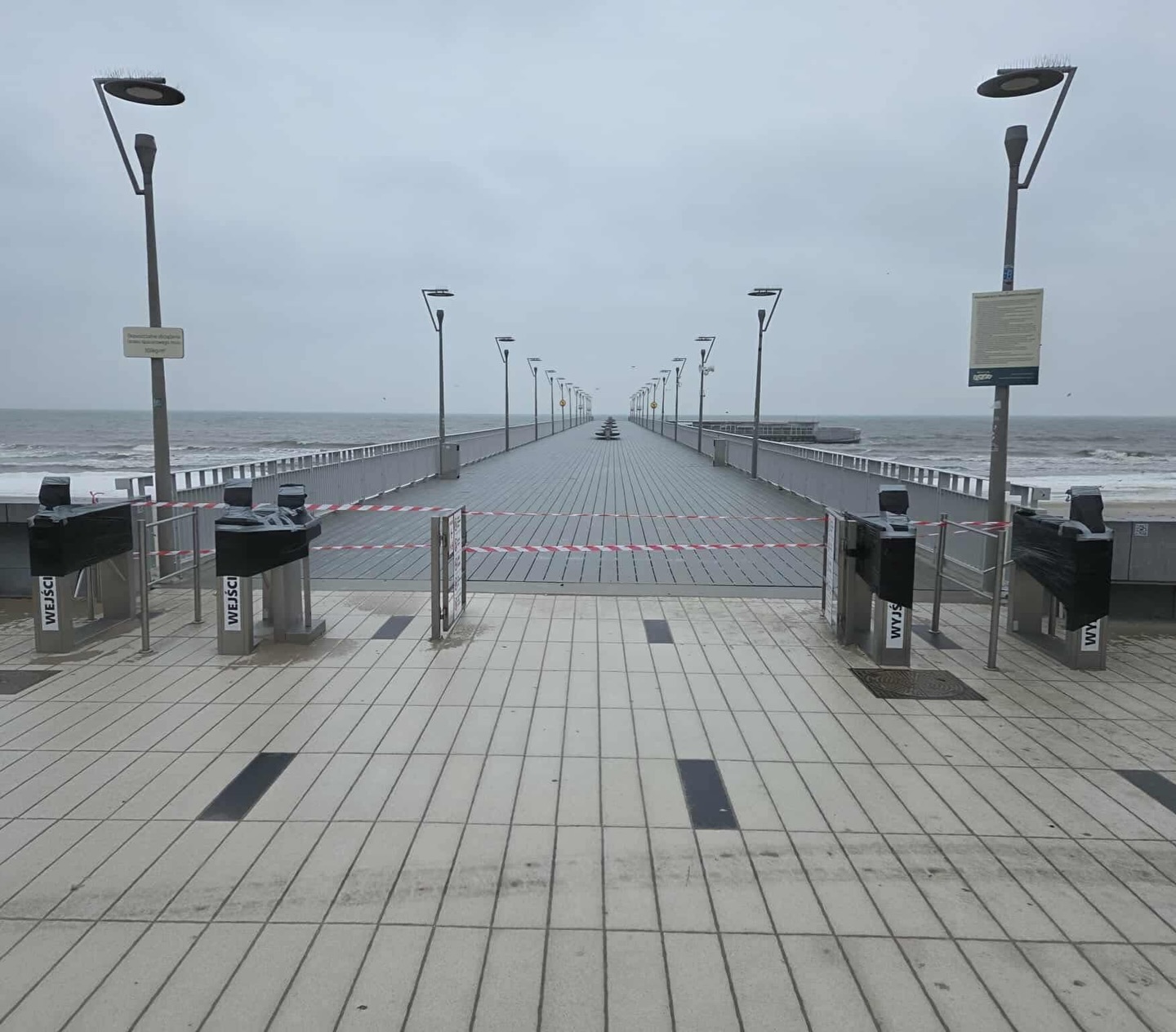 Ostatnio molo było częściowo zamknięte z powodu sztormu. Dziś obowiązuje całkowity zakaz wstępu na molo (zdjęcie na dole).