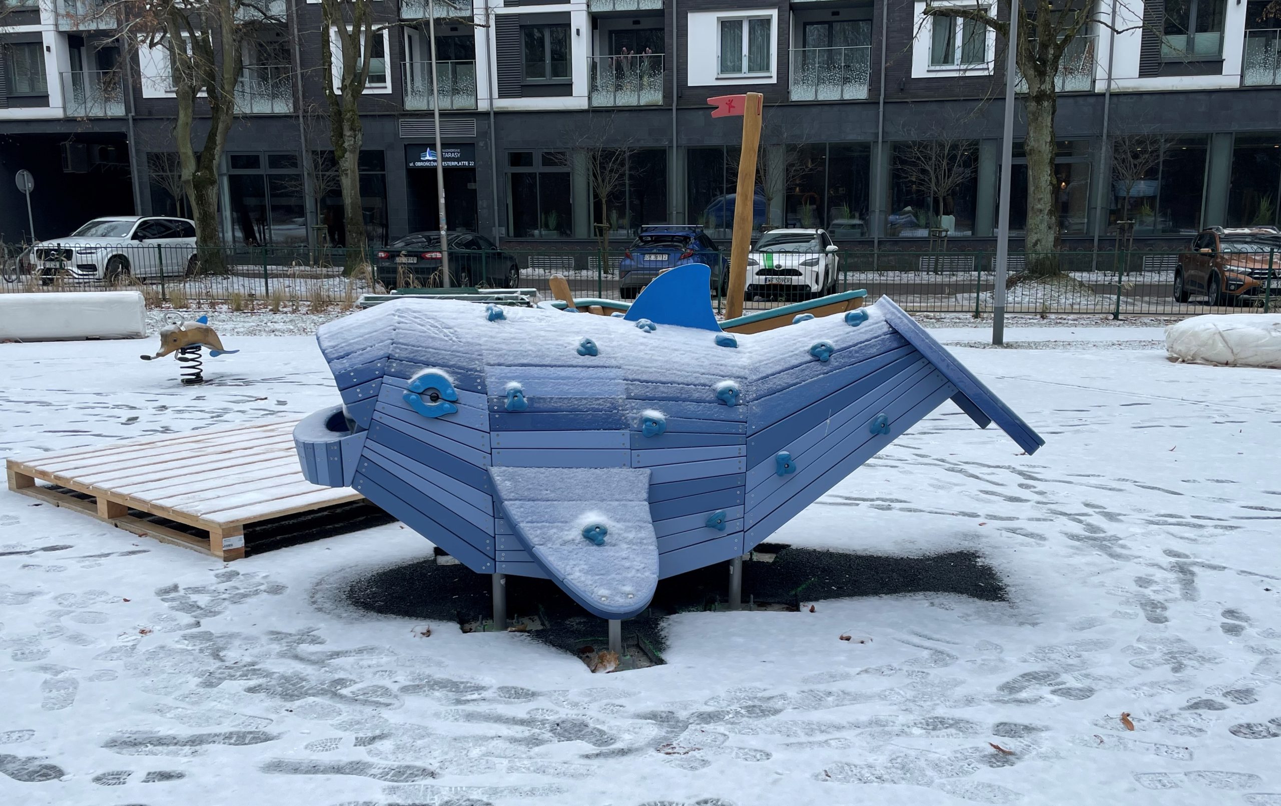 Na miejsce placu budowy przy ul. Obrońców Westerplatte, gdzie powstaje plac zabaw „Morski Raj” dotarły właśnie dwa drewniane morświny. Miejsce pomału więc nabiera charakteru i zaczyna coraz bardziej kojarzyć się z morzem.