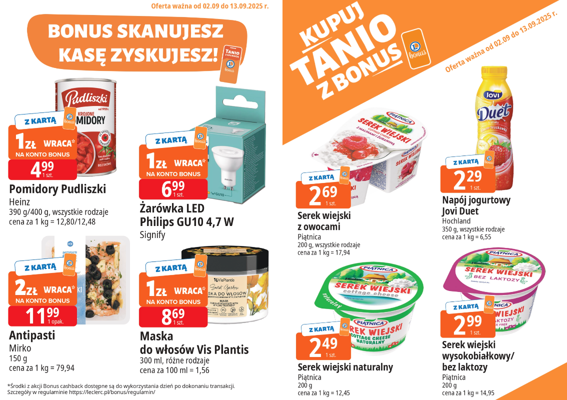 Również od jutra sklep uruchamia specjalną promocję dla swoich klientów posiadających kartę BONUS Leclerc. W ramach akcji „Bonus skanujesz kasę zyskujesz” klienci otrzymują zwrot środków do wykorzystania następnego dnia, nie tego samego. Wszystkie towary podlegające ofercie są oznaczone plakatami na sklepie.