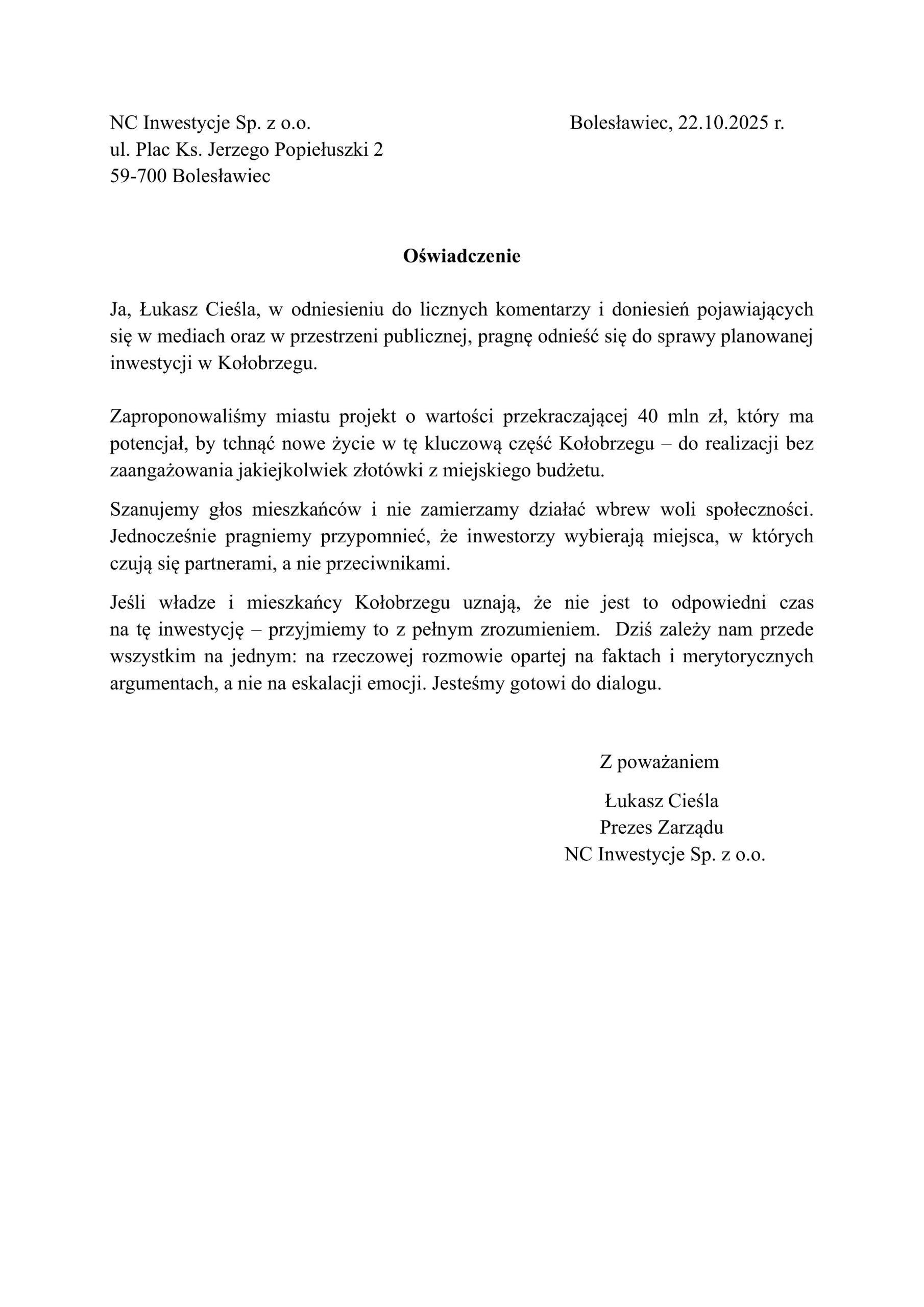Dziś do naszej redakcji inwestor – prezes zarządu spółki NC Inwestycje Łukasz Cieśla – przysłał swoje oświadczenie w tej sprawie. Umieszczamy je w całości pod tekstem.