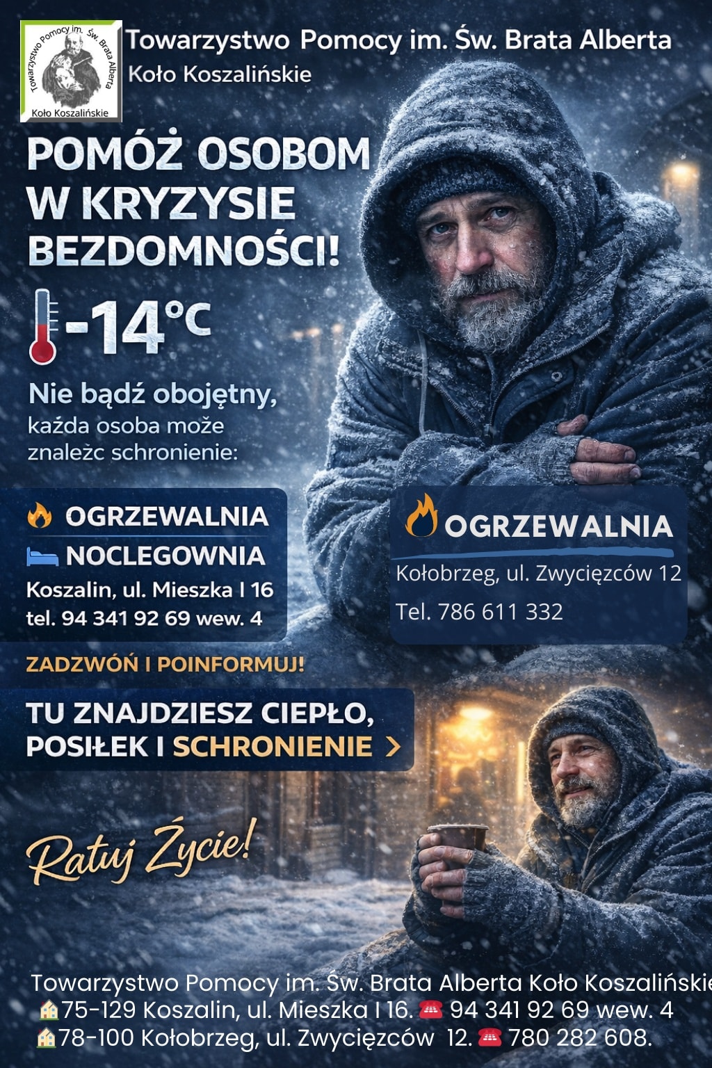 Nikt nie powinien zostać sam w kryzysie – zimą, w chłodne noce i w trudnych momentach życia – pomoc jest bliżej, niż się wydaje. Towarzystwo Pomocy im. św. Brata Alberta – Koło Koszalińskie każdego dnia otacza wsparciem osoby w kryzysie bezdomności, m.in. w Kołobrzegu.