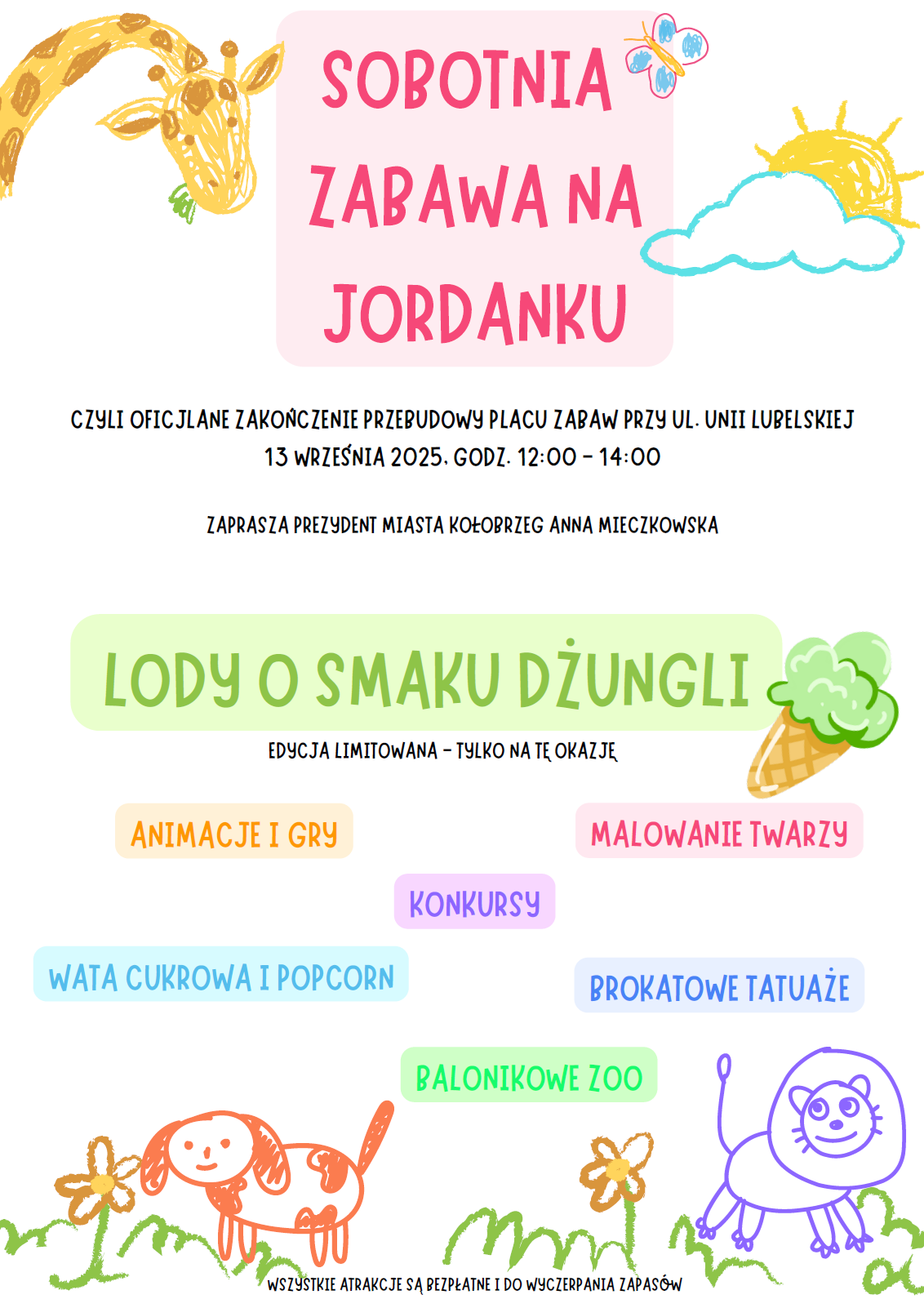 W godzinach 12:00–14:00 przy Unii Lubelskiej czekać będzie na odwiedzających mnóstwo niespodzianek: lody o smaku dżungli – edycja limitowana tylko na ten dzień, malowanie twarzy, balonowe zoo, brokatowe tatuaże, wata cukrowa i popcorn, animacje, gry i konkursy. Wszystkie atrakcje będzie bezpłatne i dostępne do wyczerpania zapasów.