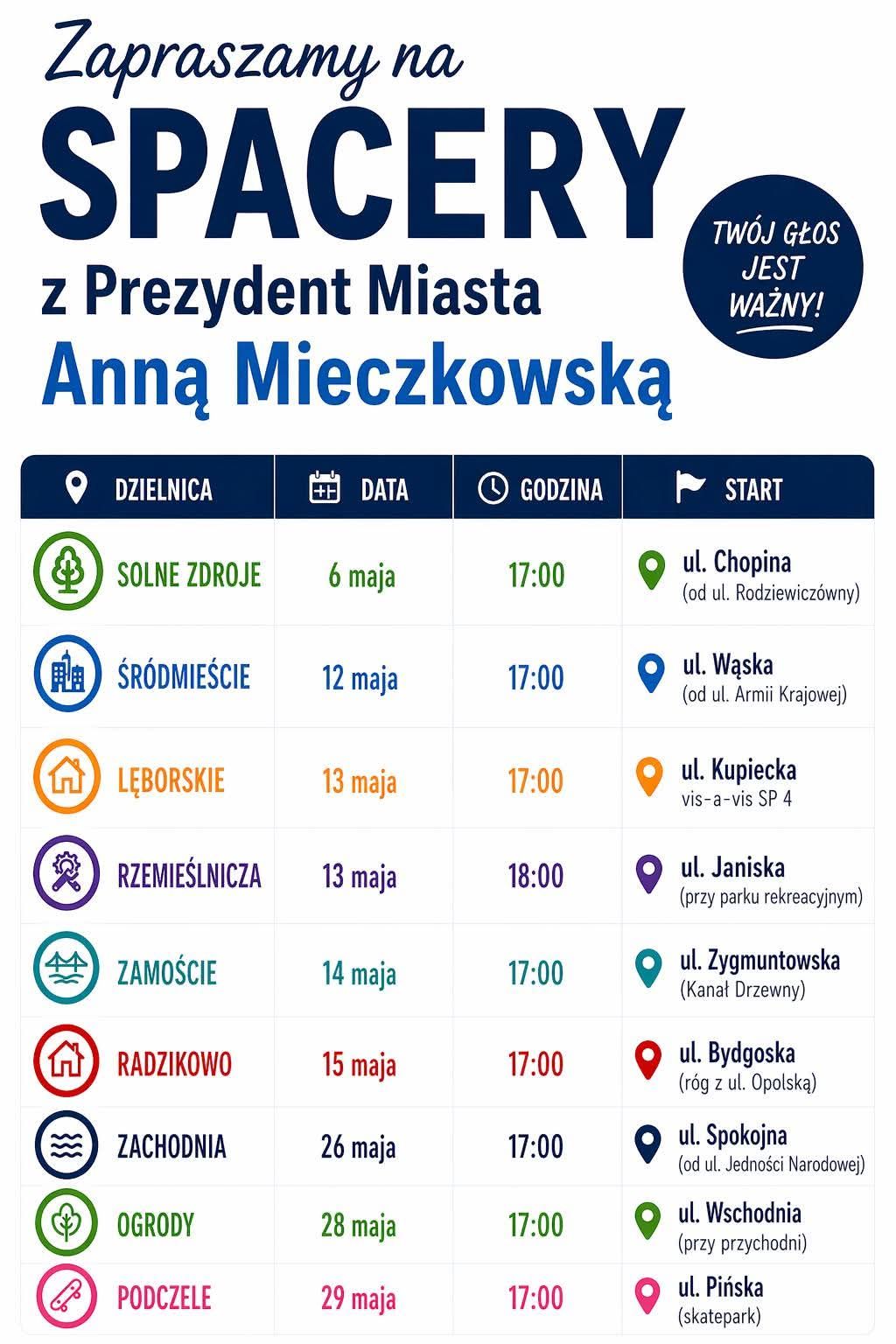 Prezydent Kołobrzegu Anna Mieczkowska zaprasza mieszkańców na cykl spacerów po kołobrzeskich dzielnicach. To okazja do bezpośredniej rozmowy o najważniejszych sprawach osiedli, zgłoszenia swoich pomysłów, uwag i potrzeb, a także wspólnego spojrzenia na przestrzeń, w której żyjemy na co dzień. Spotkania odbędą się w maju w różnych częściach miasta, a ich hasło — „Twój głos jest ważny!” — podkreśla, że opinie mieszkańców mają realne znaczenie dla dalszego rozwoju Kołobrzegu.