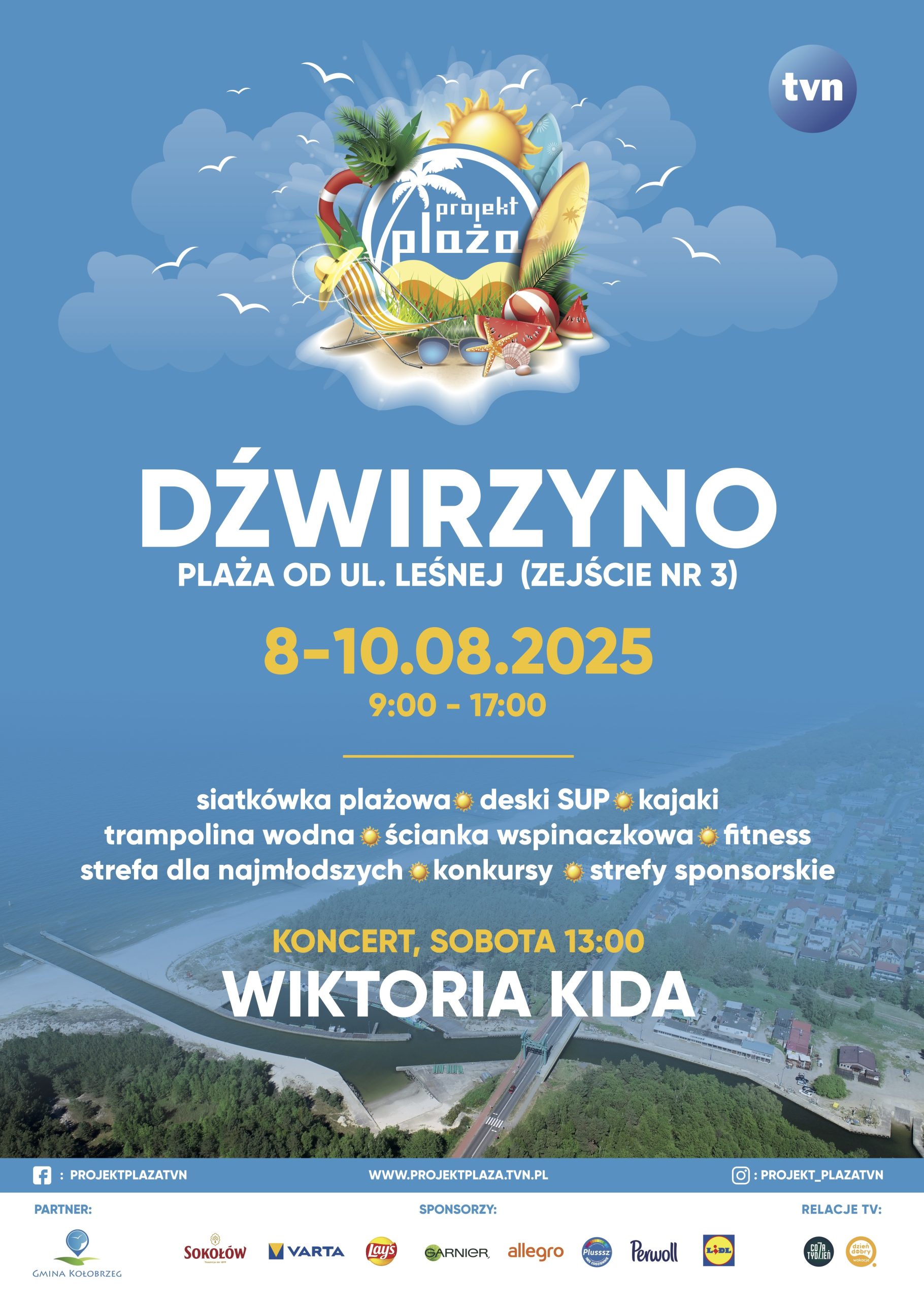 Już od 8 sierpnia w Dźwirzynie rusza Projekt Plaża TVN. W programie wydarzenia, który publikujemy poniżej, jest m.in. kino plenerowe i koncerty oraz różne aktywności sportowe na plaży.