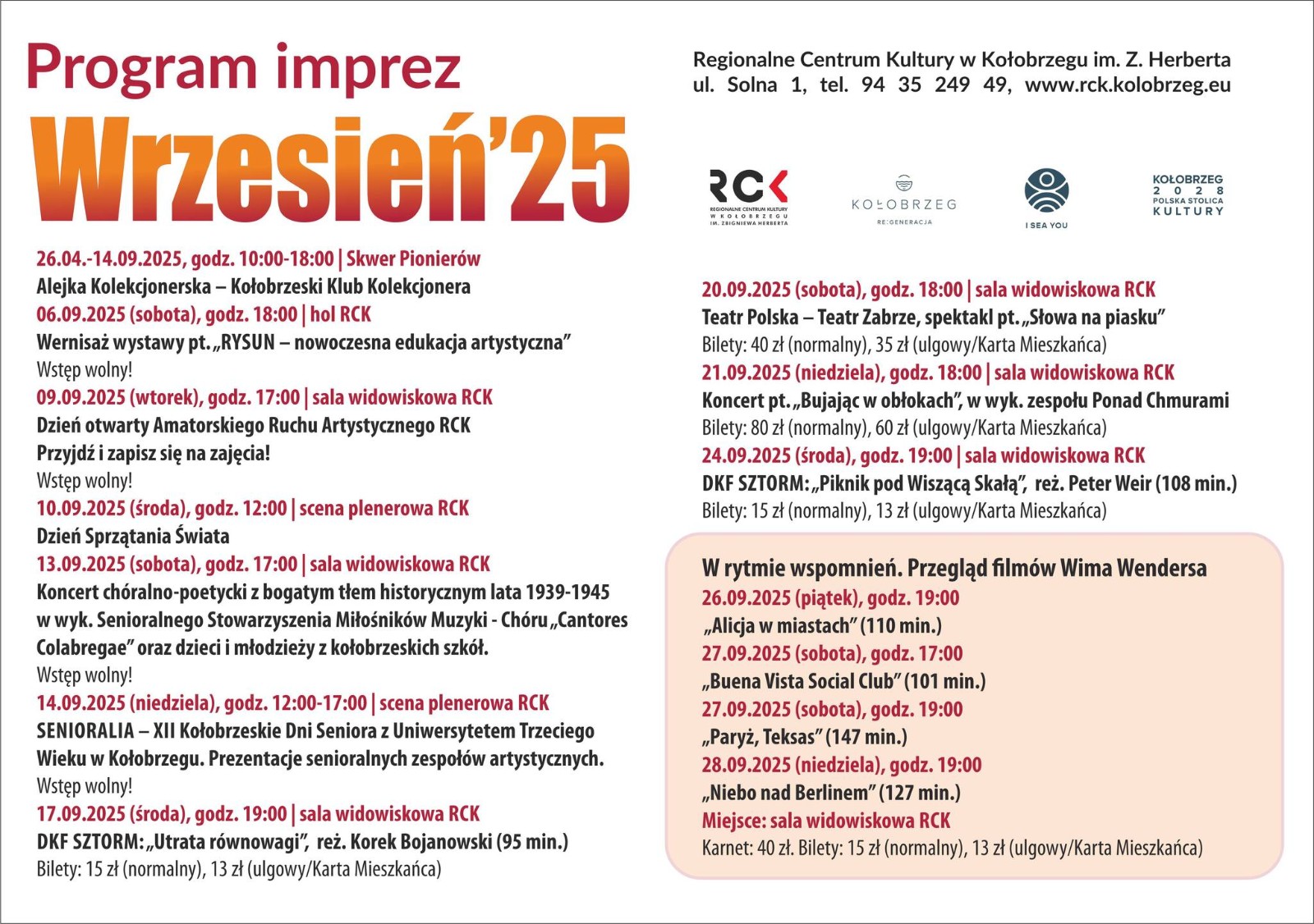 Co jeszcze? Do RCK  będziemy mogli wybrać się też na seanse w ramach Dyskusyjnego Klubu Filmowego „Sztorm”. W połowie miesiąca odbędą się XII Kołobrzeskie Dni Seniora, a 20 września do Kołobrzegu przyjedzie Teatr Polska ze spektaklem „Słowa na piasku”. Dzień później koncert w RCK zagra zespół Ponad Chmurami.