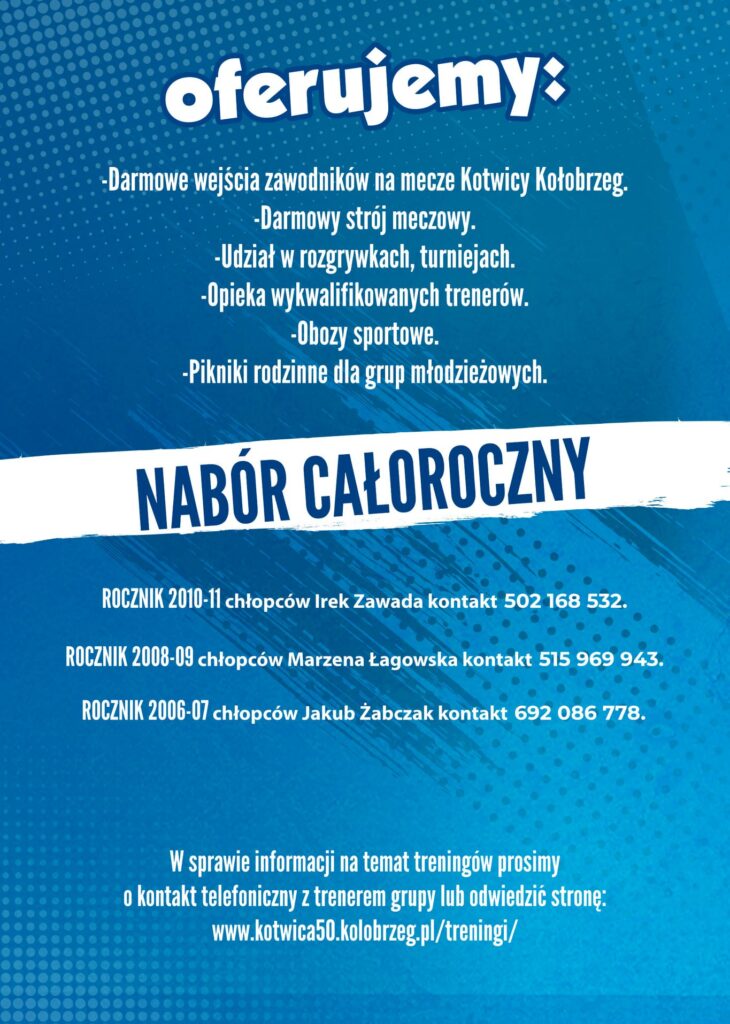 W sprawie informacji na temat treningów należy kontaktować się z trenerem danej grupy lub na stronie kotwica50.kolobrzeg.pl/młodzież.