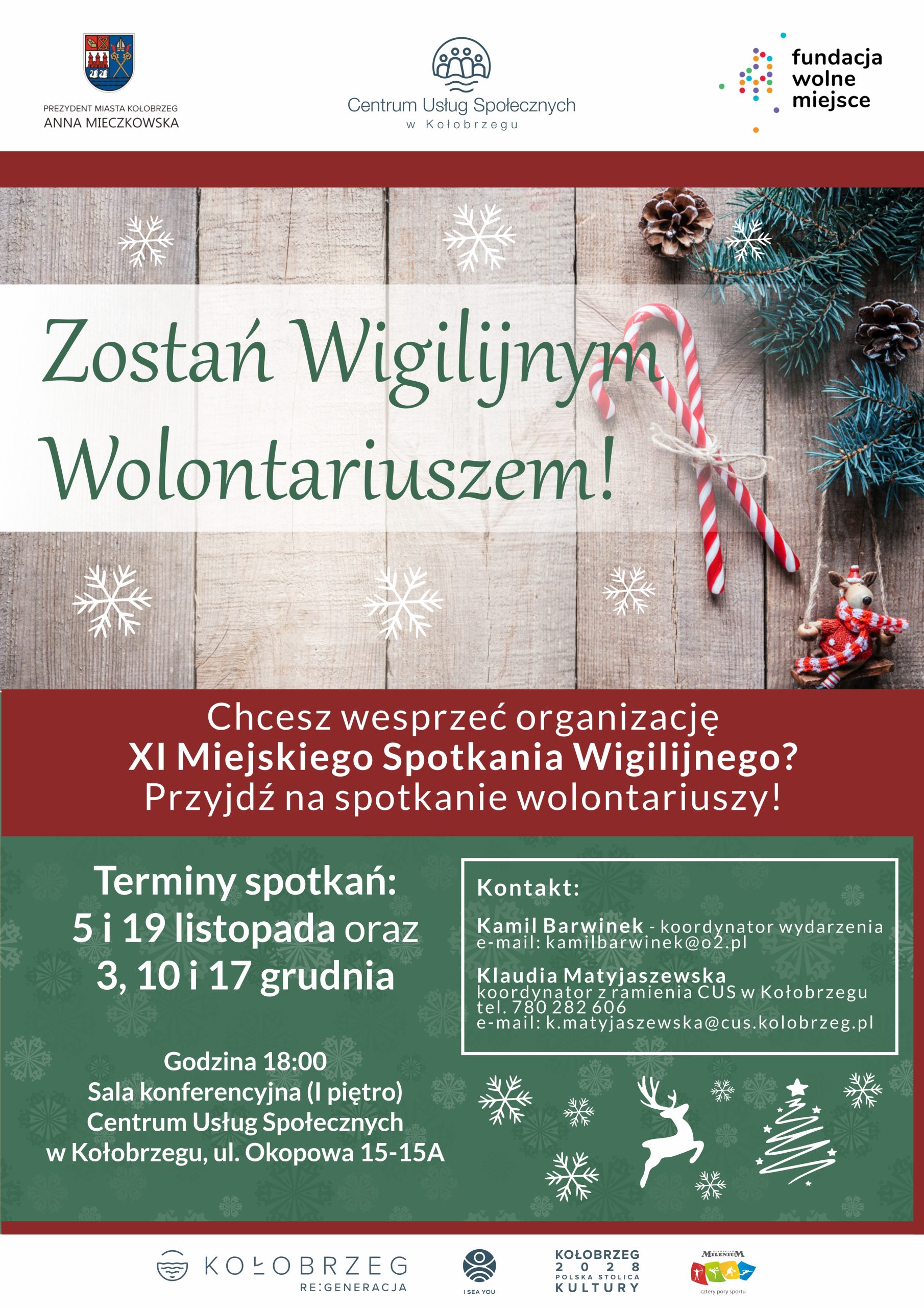 Koordynatorem XI Spotkania Wigilijnego, jak w latach poprzednich, jest Kamil Barwinek (kontakt: kamilbarwinek@o2.pl). Ze strony Centrum Usług Społecznych koordynację wolontariatu prowadzi Klaudia Matyjaszewska (tel. 780 282 606, e-mail: k.matyjaszewska@cus.kolobrzeg.pl).