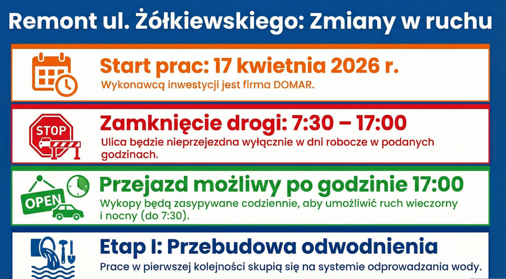 Wykonawca przebudowy ul. Żółkiewskiego (firma DOMAR) poinformował, że 17 kwietnia rozpoczną się prace budowlane i zostanie wprowadzona czasowa organizacja ruchu.