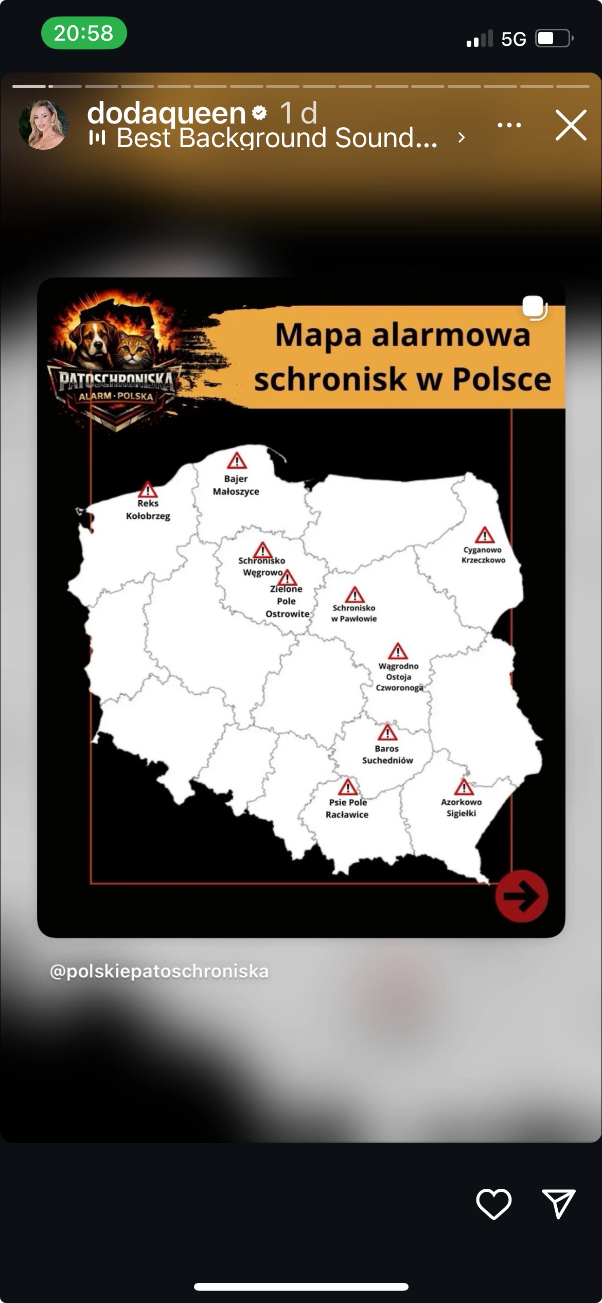 We wtorkowy wieczór w sieci zawrzało po tym, jak w mediach społecznościowych zaczęła krążyć tzw. „mapa alarmowa” (nazywana też „mapą wstydu”), przedstawiająca schroniska oceniane przez autorów zestawienia jako miejsca „nieprzyjazne zwierzętom”. Na grafice znalazło się również Schronisko Dla Zwierząt REKS w Kołobrzegu, prowadzone przez Stowarzyszenie REKS. Sprawa stała się głośna, gdy materiał udostępniła Dorota Rabczewska (Doda), która od pewnego czasu angażuje się w działania prozwierzęce i nagłaśnianie problemów związanych z funkcjonowaniem części placówek w Polsce. Dziś o godz. 20.50, gdy sprawdzaliśmy ostatni raz, schematyczna mapa z zaznaczonym na niej kołobrzeskim schroniskiem wciąż była widoczna na Instastories celebrytki.