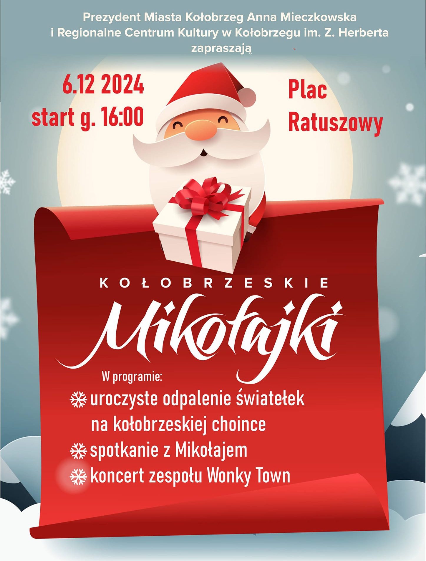 Tradycyjnie w Mikołajki 6 grudnia o godzinie 16:00 przed ratuszem zabłysną światełka na kołobrzeskiej choince, i pozostałe świąteczne ozdoby w mieście. Urząd Miasta zaprasza tego dnia na spotkanie z Mikołajem i koncert zespołu Wonky Town, który zagra dobrze wszystkim znane świąteczne przeboje. Szczegóły na plakacie.