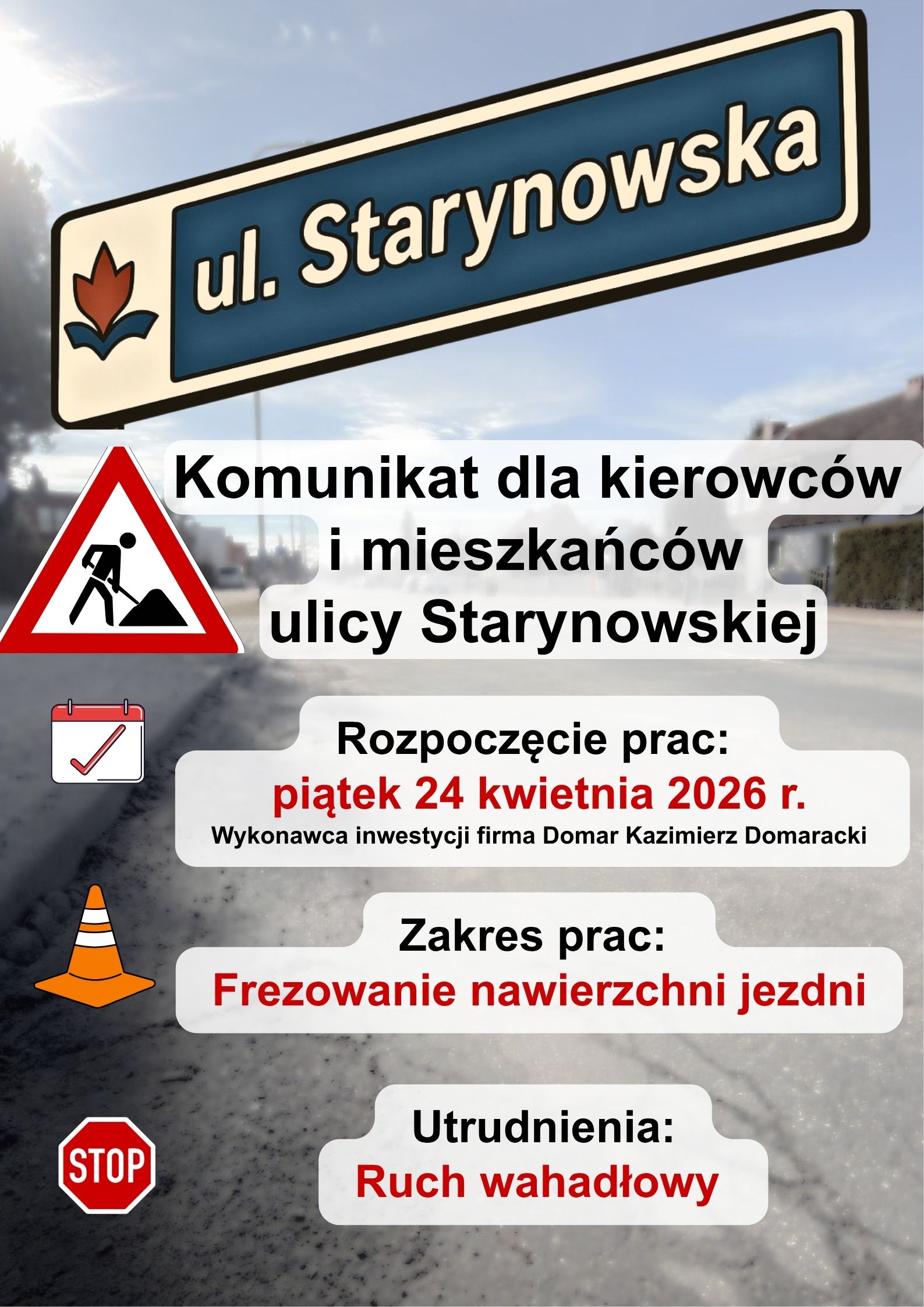 Zarząd Dróg Powiatowych w Kołobrzegu informuję, że firma Domar Kazimierz Domaracki, wykonawca remontu nawierzchni na ul. Starynowskiej w Kołobrzegu, od piątku 24 kwietnia 2026 roku rozpoczyna prace związane z frezowaniem nawierzchni jezdni.