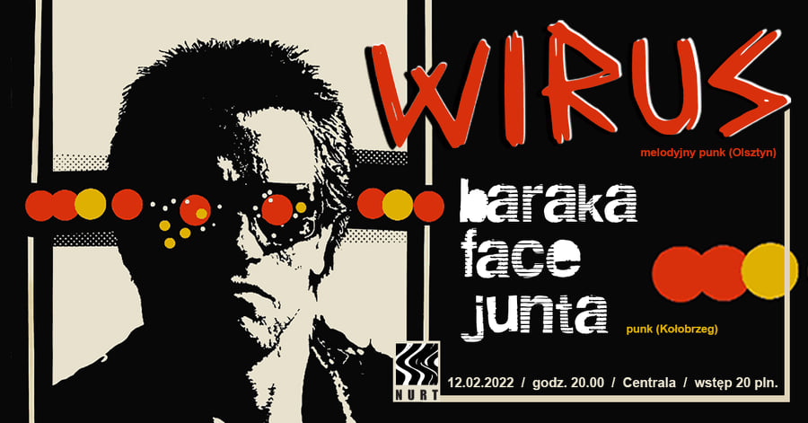 12 lutego klub Centrala zaprasza na koncert grupy WIRUS z Olsztyna oraz kołobrzeskiego składu BARAKA FACE JUNTA. Start o godz. 20. Bilety 20 zł młodzież do 18 roku życia – 15 zł).