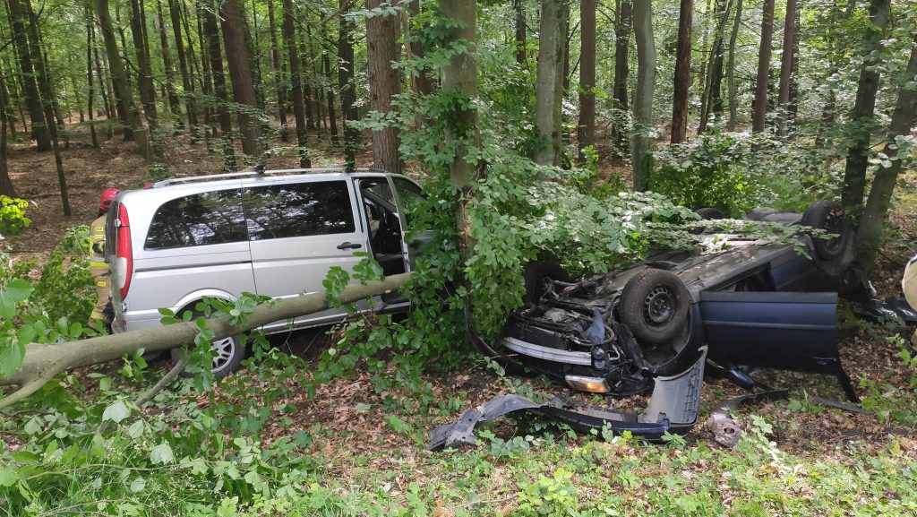 W wyniku zderzenia mercedesa i volkswagena oba pojazdy wypadły z drogi i zatrzymały się w lesie.