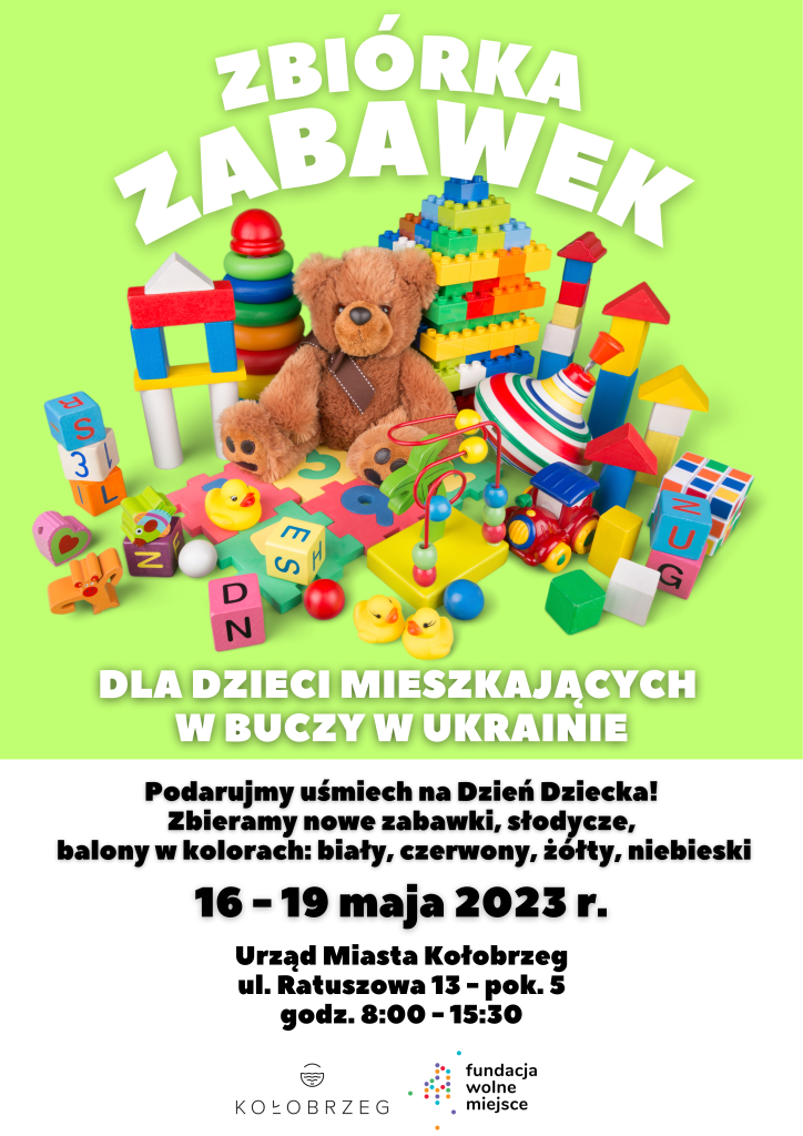 Choć przez chwilę wywołaj uśmiech na dziecięcych buziach i weź udział w akcji -z okazji Dnia Dziecka Urząd Miasta Kołobrzeg oraz Fundacja Wolne Miejsce organizują zbiórkę zabawek dla dzieci mieszkających w Buczy, w Ukrainie.