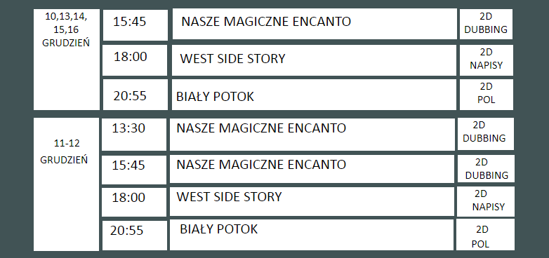 10 grudnia zmienia się repertuaru w kinie Wybrzeże. Na afisz wchodzi animowany film familijny „Nasze magiczne Encanto”, „West Side Story” w reżyserii Stevena Spielberga oraz polska komedia pomyłek „Biały potok”.