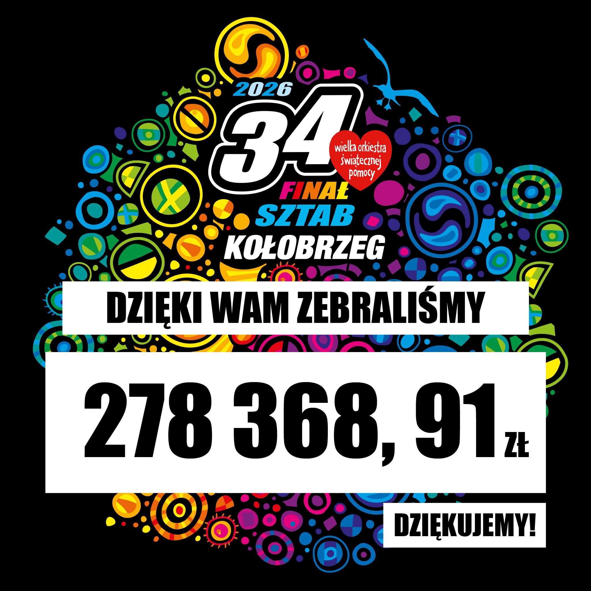 Deklarowana kwota na godzinę 20:00 z kwesty ulicznej, e-skarbonki i aukcji Allegro 34. Finału WOŚP w Kołobrzegu, wyniosła 278 368, 91 zł.